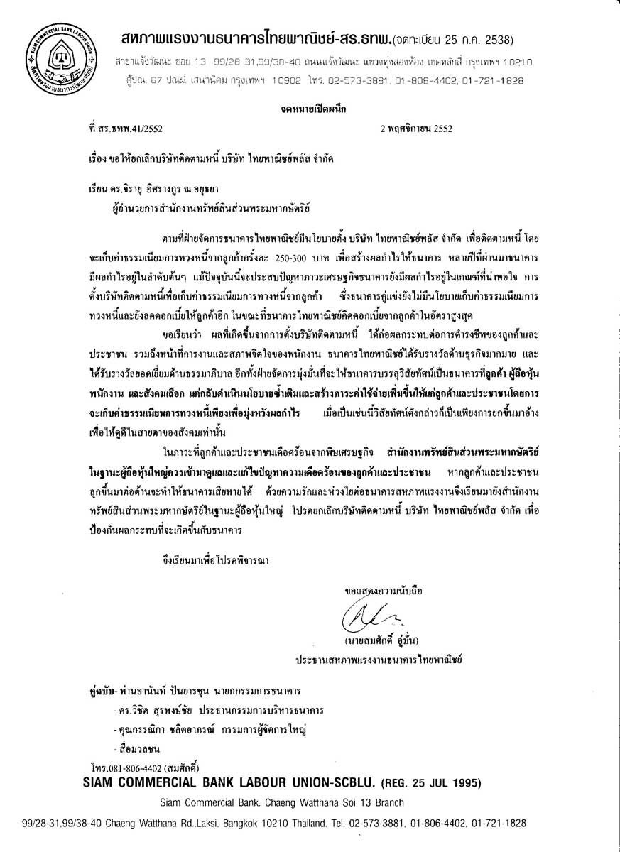 สร.ธทพ.41/2552 ขอให้ยกเลิกบริษัทติดตามหนี้ บริษัท ไทยพาณิชย์พพัส จำกัด