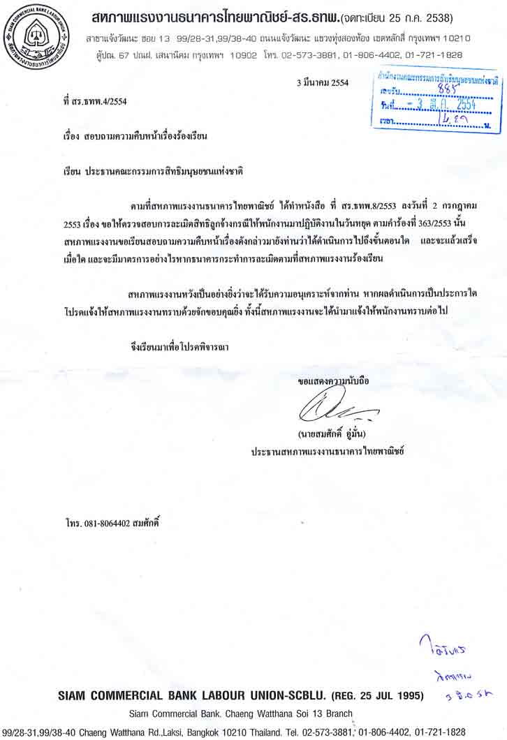 สร.ธทพ.4/2554 สอบถามความคืบหน้าเรื่องร้องเรียน