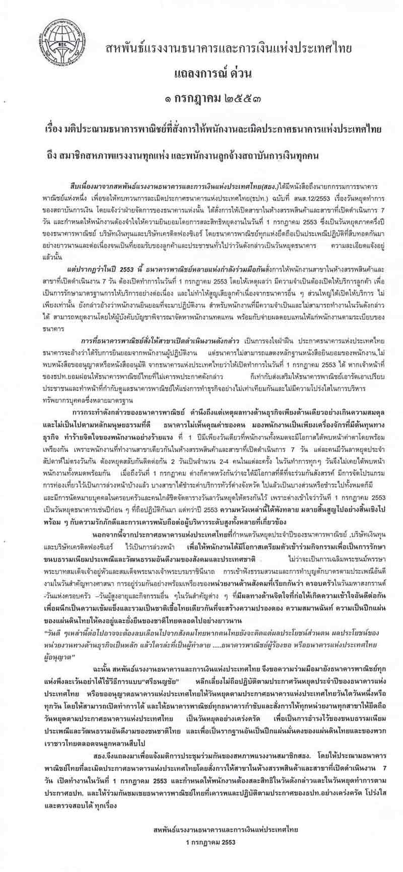 แถลงการณ์ด่วน 1 กรกฎาคม 2553